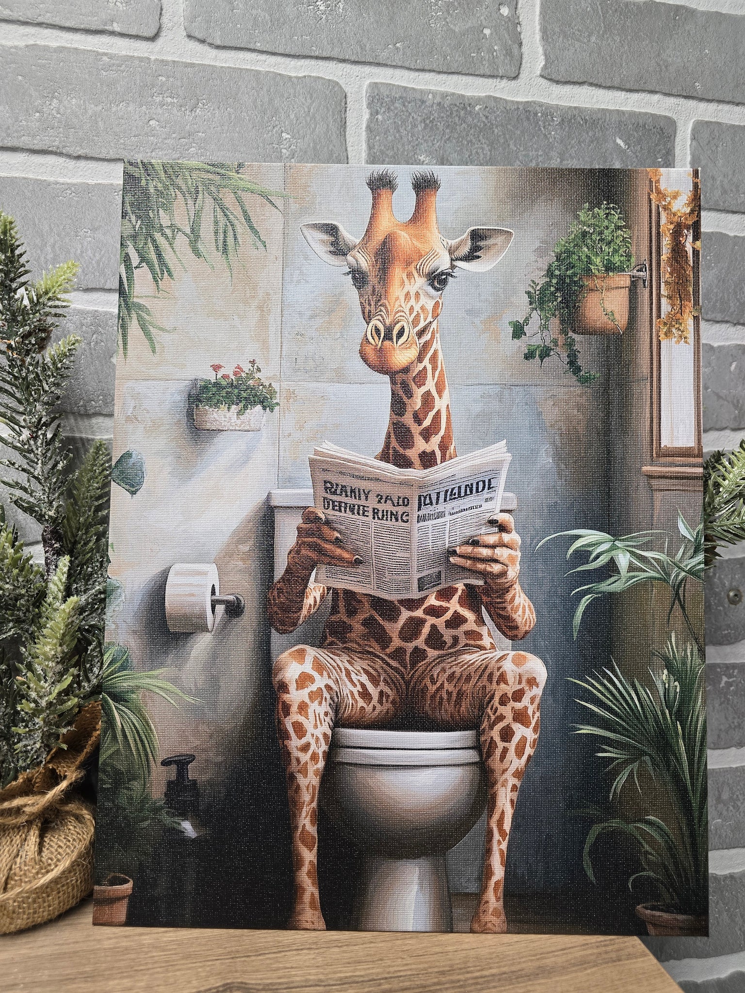 Add unexpected humor and personality to your space with this giraffe bathroom canvas art. Featuring a relaxed giraffe casually reading the paper while seated on the toilet, this whimsical artwork blends realistic detail with a lighthearted twist. Soft neutral tones, warm browns, and lush greenery create a balanced look that feels playful without being overpowering.