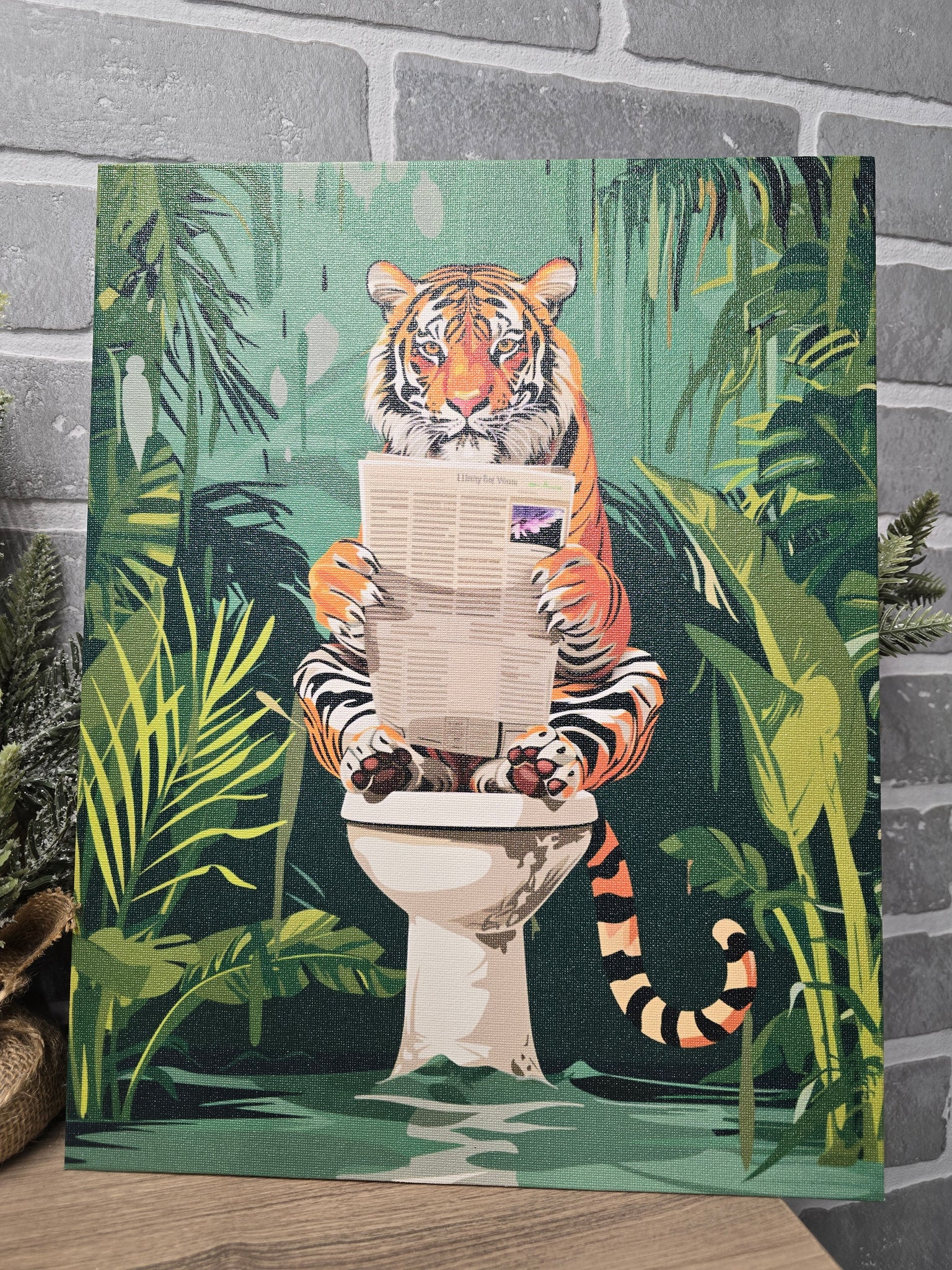 Add a wild sense of humor to your décor with this jungle tiger canvas art. Featuring a confident tiger casually reading the paper while perched in a lush jungle setting, this playful artwork combines bold color, personality, and a cheeky twist. Rich greens, warm oranges, and graphic details give the piece a modern, eye-catching look that instantly draws attention.