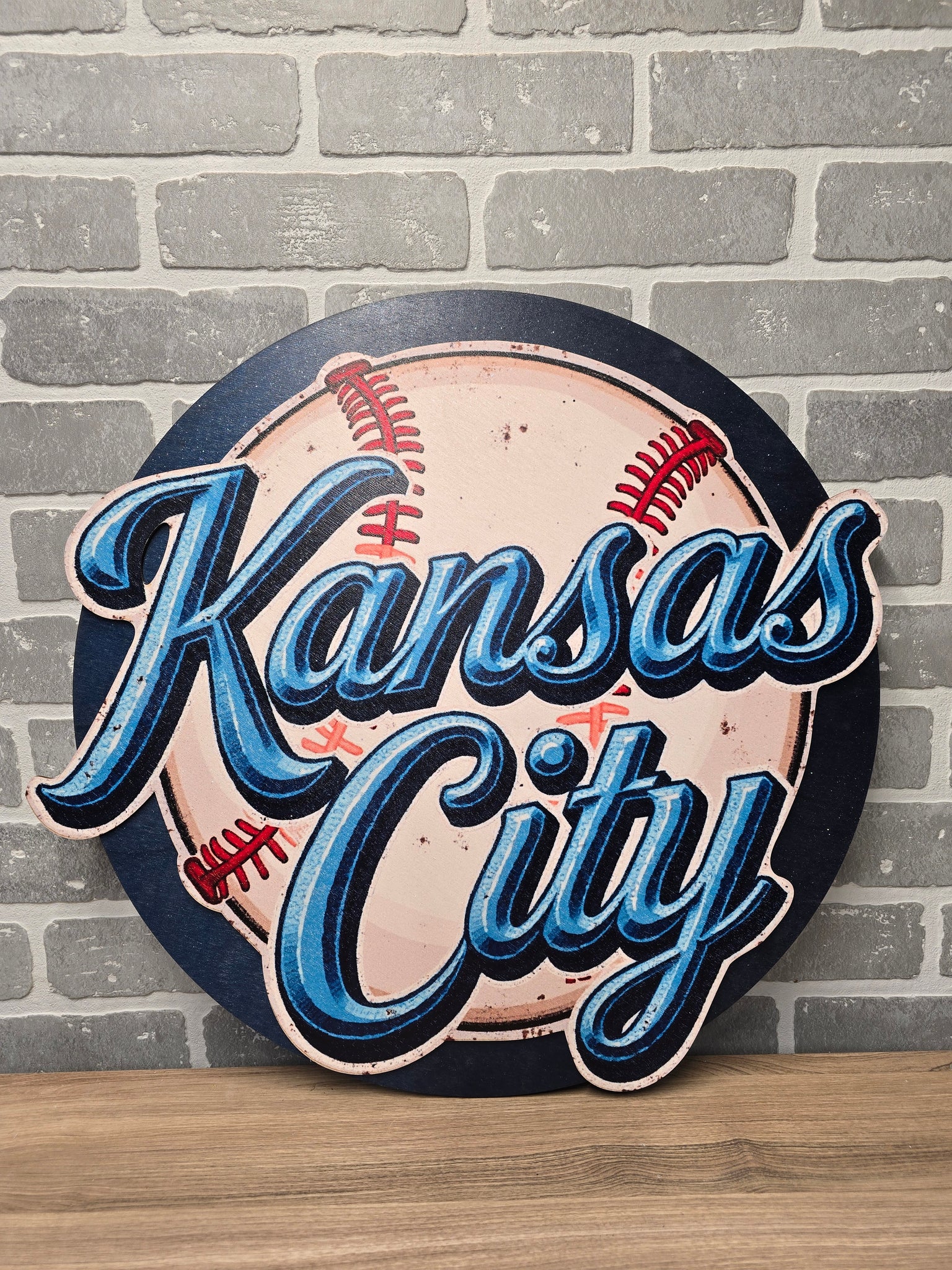 how off your KC pride with this bold and vintage-inspired Kansas City Blue Baseball door sign! Featuring a distressed baseball backdrop with layered blue script lettering, this design brings classic ballpark vibes straight to your front porch.